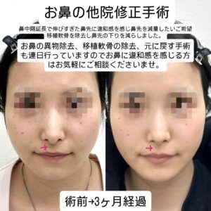 こちらのモニター様は他院様での鼻中隔延長後に不自然に伸びすぎた鼻先の違和感を元に戻したいご希望の方でした。