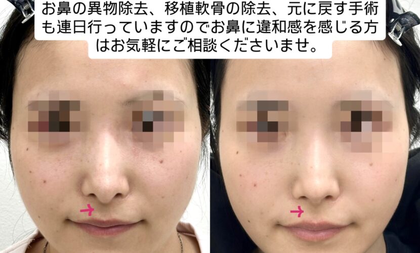 再度オープン法にてアプローチし移植軟骨を適量除去減量し下の鼻先に戻しています。
