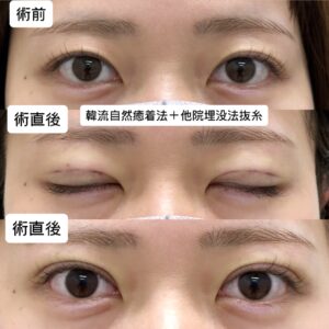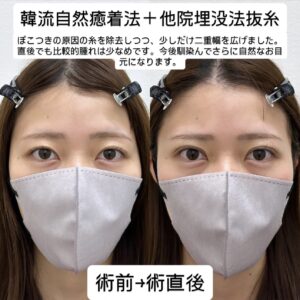 こちらのモニター様は他院様での埋没後のポコつきを抜糸にて除去しつつ韓流自然癒着法にて自然に全体的に少しだけラインを広げられた方になります。