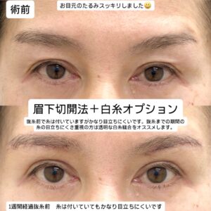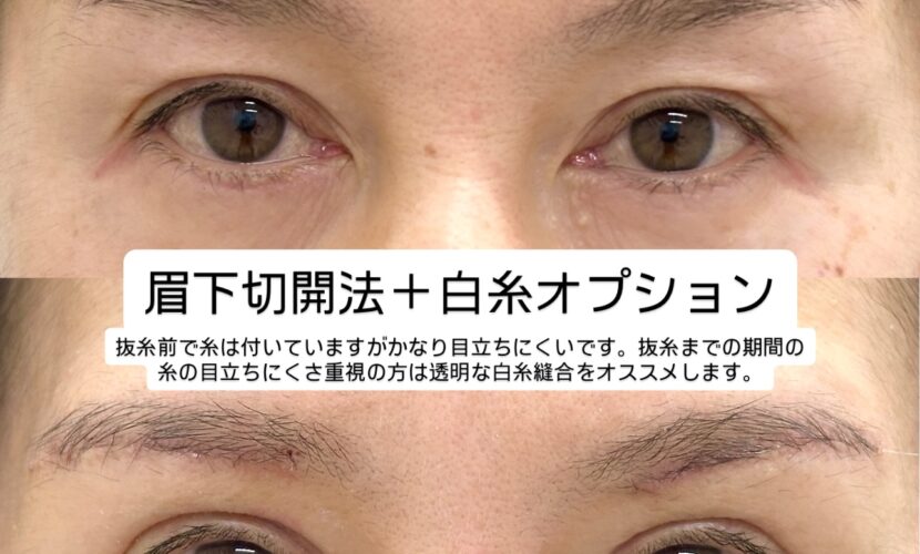 今回は上まぶたのたるみを取るべく眉下の部分を毛包斜切開にて行い糸が目立ちにくいように白い透明な糸で縫合しています。