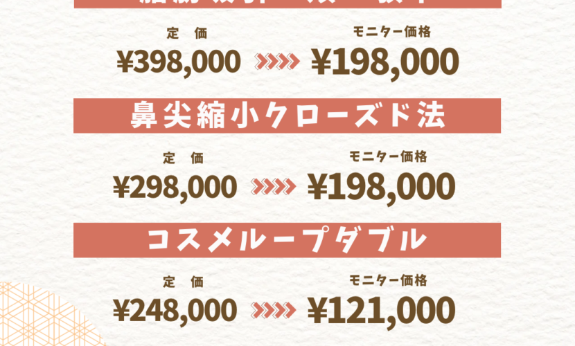 現在実施中のキャンペーンです 2026.01.5 お知らせ 鼻整形・小顔整形・晴れの少ない埋没法・糸リフトなどが特別価格となります。診察・施術は必ず院長で美容外科専門医の松村が担当いたします。診察・お見積もり発行は無料ですのでお気軽にご相談いただけますと幸いです。 2026年1月の開院スケジュールです 前の記事
