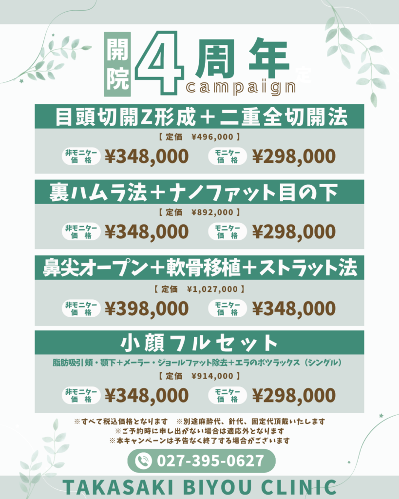 開院4周年記念にてお得なメニューを設定しています。ご希望の方はお気軽にご相談くださいませ。